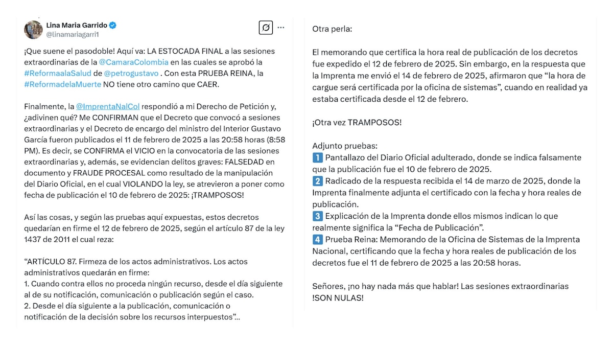 En su cuenta de X, la congresista de Cambio Radical publicó la respuesta de la Imprenta Nacional a un derecho de petición sobre los tiempos en los que fue expuesta la convocatoria a las sesiones extraordinarias de la Cámara, al principio de febrero de 2025.