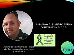 El 4 de enero, en el municipio de Curumaní, Cesar, el Patrullero Alejandro Serna Echeverry, se encontraba en su lugar de residencia, pasando unos días de vacaciones, al tiempo que delincuentes armados llegaron a su casa y sin mediar palabra le dispararon. Paz en la tumba de este Héroe.