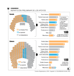 Las cuentas aún no son definitivas y podrían variar de aquí al 20 de julio, cuando se posesione el Congreso. Por lo pronto, lo único claro es que la bancada de Gobierno estará compuesta por el Pacto Histórico, la mayoría de la Centro Esperanza, algunos minoritarios y el Partido Liberal, que juntos suman 53 de las 108 curules en Senado y 100 de las 188 en la Cámara.