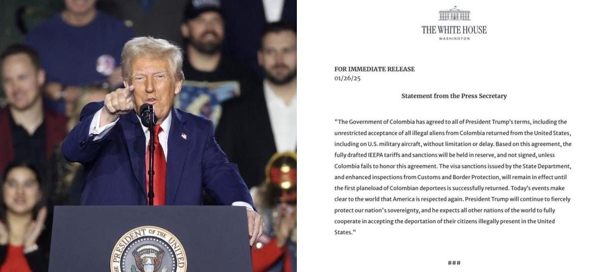 Un reciente comunicado del gobierno de los Estados Unidos confirma que el Gobierno de Colombia ha aceptado todos los términos del presidente Trump, incluida la aceptación irrestricta de todos los extranjeros ilegales de Colombia regresados de los Estados Unidos, incluso en aviones militares estadounidenses, sin limitación ni demora.