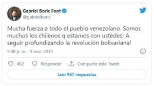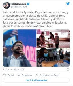 Y no solo vale destacar el respaldo del chavismo a Boric sino también el apoyo que ha dado Boric al chavismo. El ahora presidente electo de Chile había anunciado desde 2013 que iban –en plural– a «seguir profundizando la revolución bolivariana». En 2019 hizo honor a esta promesa en las calles, ahora lo ratificó en las urnas.