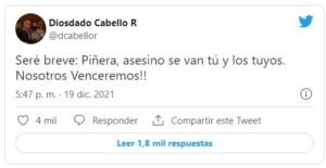 De igual manera, Diosdado Cabello, el número dos del régimen chavista, celebró la victoria de Boric, cuya popularidad surgió por su rol como manifestante. Cabe destacar que salió de boca de Diosdado Cabello el término «brisas bolivarianas» para denominar a los disturbios, saqueos y destrozos que empezaron en octubre de 2019 y causaron caos y desestabilización en Chile.