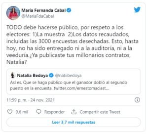 Su slogan “100 % Cabal” le ha servido para matizar la solicitud de ser ubicada como la número 100 de la lista de candidatos al Senado, tras habérsele negado ser la primera, una posición que esperaba luego de haber quedado en el segundo puesto de las encuestas que dieron como ganador al exministro de Hacienda y Crédito Público, Óscar Iván Zuluaga. Una elección que dejó un sabor amargo tanto en la senadora como en sus seguidores por la aparente falta de transparencia en la divulgación de los resultados, ante lo cual ella tampoco se calló.