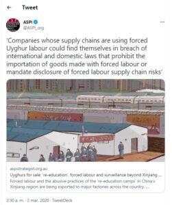 Un nuevo informe del ASPI (Instituto de Política Estratégica de Australia), «Uyghurs for Sale» (Uigures en venta), denuncia que el gobierno chino ha facilitado la transferencia masiva de uigures y otros ciudadanos de minorías étnicas desde Xinjiang a fábricas en todo el país.