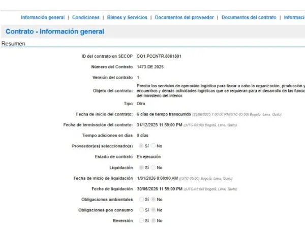 El convenio, que tiene como objeto “prestar los servicios de operación logística para llevar a cabo la organización, producción y ejecución de los eventos, encuentros y demás actividades logísticas que se requieran para el desarrollo de las funciones, planes, programas y metas del Ministerio del Interior”, se suscribió por apenas 189 días, pues terminará el próximo 31 de diciembre.