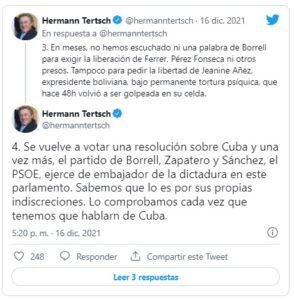 El eurodiputado Hermann Tertsch, de Vox, sostiene que el partido de Sánchez, de José Luis Rodríguez Zapatero y del Alto Representante de la UE para Asuntos Exteriores y Política de Seguridad y vicepresidente de la Comisión Europea, Josep Borrell, actúa como “embajador de la dictadura de Cuba en el parlamento”.