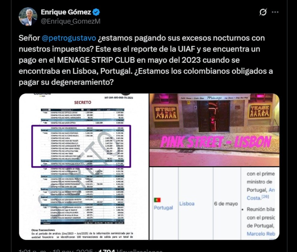 “Señor Petro Gustavo ¿estamos pagando sus excesos nocturnos con nuestros impuestos? Este es el reporte de la UIAF y se encuentra un pago en el MENAGE STRIP CLUB en mayo del 2023 cuando se encontraba en Lisboa, Portugal. ¿Estamos los colombianos obligados a pagar su degeneramiento?“, señaló Enrique Gómez.