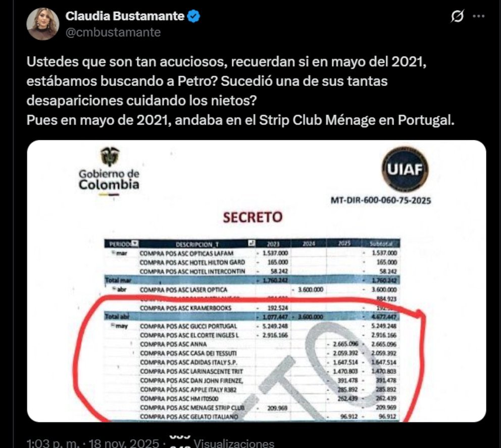 El hecho, ha generado múltiples reacciones en redes sociales. La usuaria Claudia Bustamante precisó: “Ustedes que son tan acuciosos, recuerdan si en mayo del 2021, estábamos buscando a Petro? Sucedió una de sus tantas desapariciones cuidando los nietos? Pues en mayo de 2021, andaba en el Strip Club Ménage en Portugal”.
