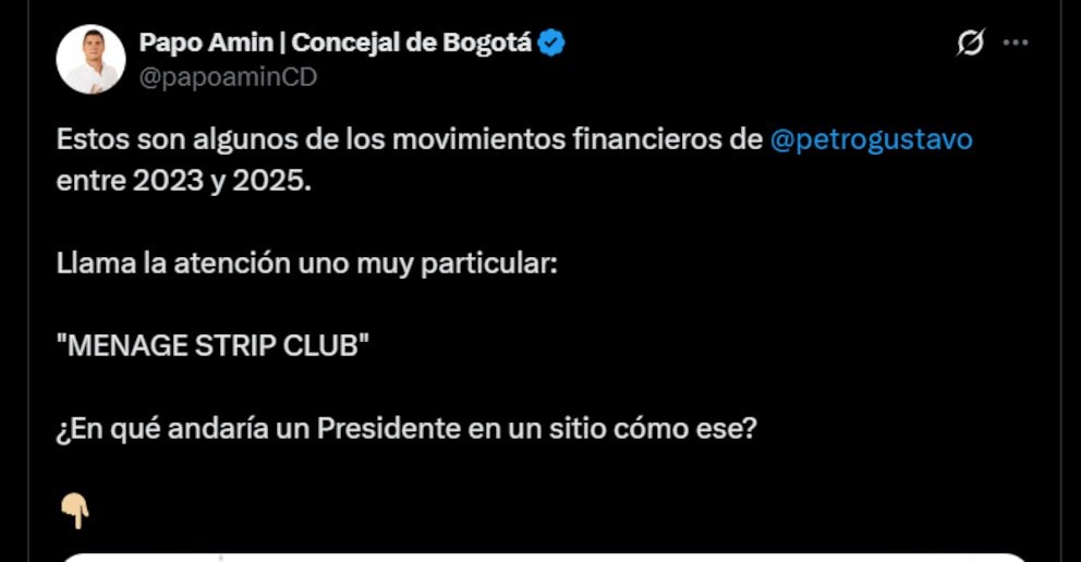 “Estos son algunos de los movimientos financieros de Gustavo Petro entre 2023 y 2025. Llama la atención uno muy particular: “MENAGE STRIP CLUB” ¿En qué andaría un Presidente en un sitio cómo ese?“, indicó Papo Amín.