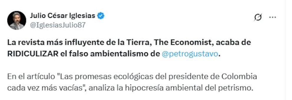 En su publicación, Iglesias subrayó que el texto pone en evidencia lo que considera una hipocresía en las políticas ambientales del Gobierno de Petro.