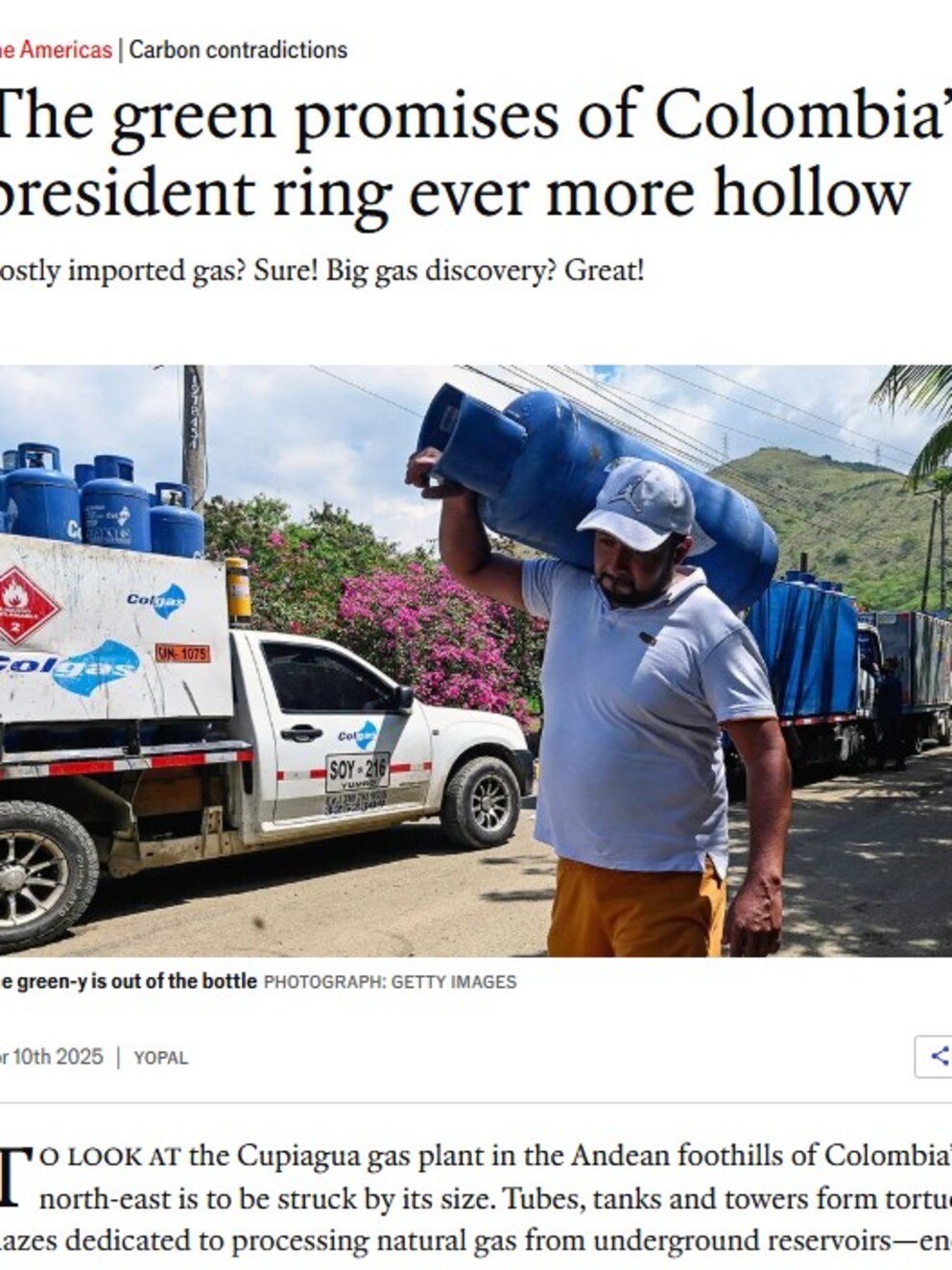 De acuerdo con The Economist, uno de los ejemplos más claros de estas contradicciones se encuentra en la planta de gas de Cupiagua, ubicada en el noreste de Colombia, en las estribaciones de los Andes.